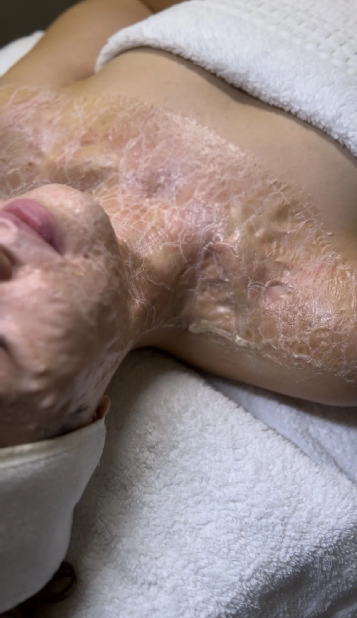Following a skin analysis your skin is cleansed and pre treated with an exfoliating treatment specifically chosen for your needs. Next DMK Enzyme mask is applied to the skin and allowed to set for 45 minutes. During this time you will be treated to a complimentary scalp, hand and foot massage
